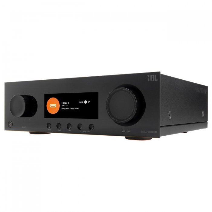 The JBL MA7100HP is a high-performance AV Receiver that delivers stunning realism with the latest 8K HDMI specifications and native 7-channel decoding of immersive audio from Dolby Atmos and DTS:X for the ultimate home cinema experience. Seamlessly integrate your smart TV or projector with 6 HDMI inputs and 2 outputs, plus eARC. Designed with a passion for music and movies, the MA7100HP brings both to life with true high fidelity. The MA7100HP features seven channels of low-noise Class D amplification for real world power to all channels. In addition to the onboard Moving Magnet phono input for connecting a turntable, additional music content can be accessed immediately with integrated streaming using Apple Airplay2, Google Chromecast, and Bluetooth AptX Adaptive. Taking performance to the next level, the MA7100HP comes "Dirac Live Ready" for automatic room correction, assuring audiophile-quality sonics and allows integrators and power-users to optimize the system to their personal room acoustics. Featuring a secondary HDMI video output and audio Zone, content can also be made available in a secondary location. In addition to physical controls, the MA7100HP allows for IP control for third party control system integration.